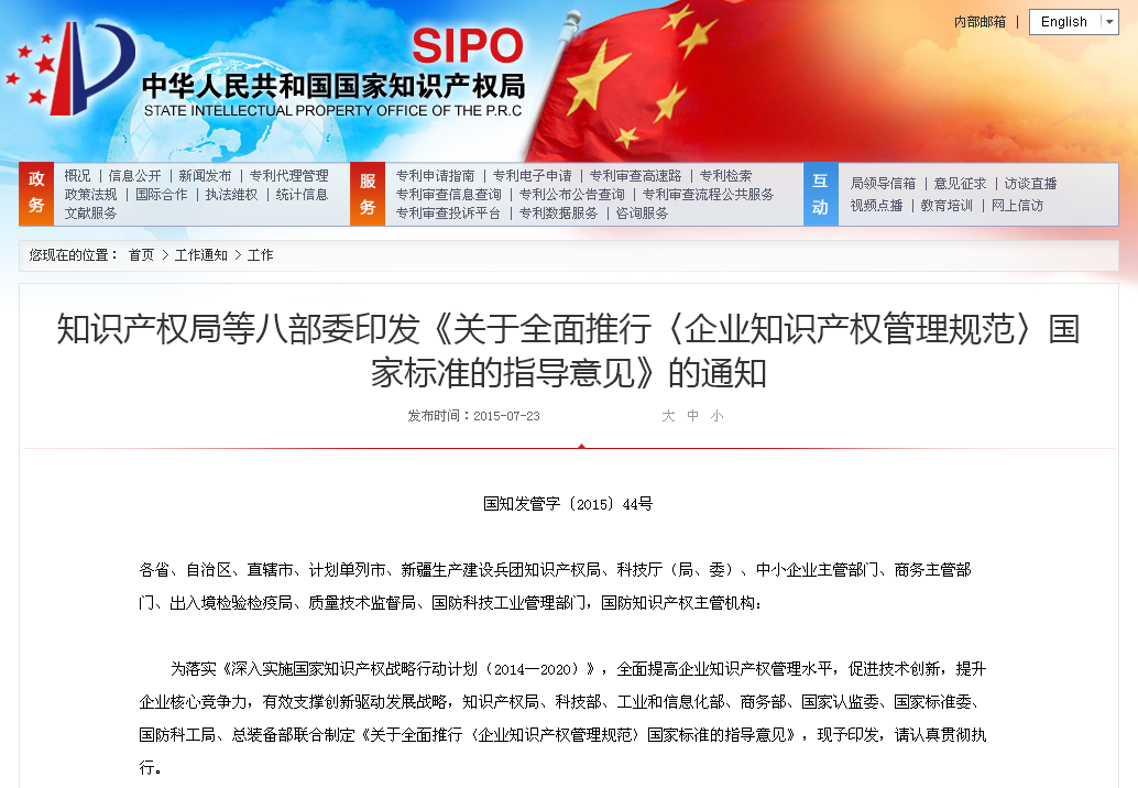 “貫標”對于企業來說,就是貫徹《企業知識產權管理規范》國家標準。企業知識產權管理規范的國家標準由國家知識產權局制訂,經由國家質量監督檢驗檢疫總局、國家標準化管理委員會批準頒布,于2013年3月1日起實施,標準號是GB/T29490-2013。目前,全國各地都在陸續推行這一標準。