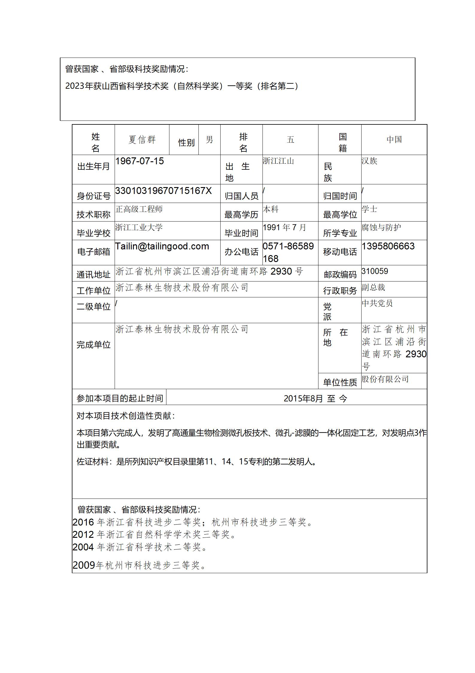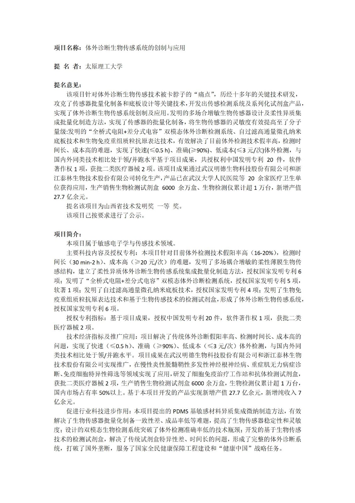 根據山西省科學技術廳關于山西省技術發明獎提名工作的相關規定,浙江泰林生物技術股份有限公司、太原理工大學、武漢明德生物科技股份有限公司合作研發的科技成果“體外診斷生物傳感系統的創制與應用”擬提名2024年度山西省技術發明獎一等獎,現予以公示。公示期2024年12月09日至2024年12月15日。
